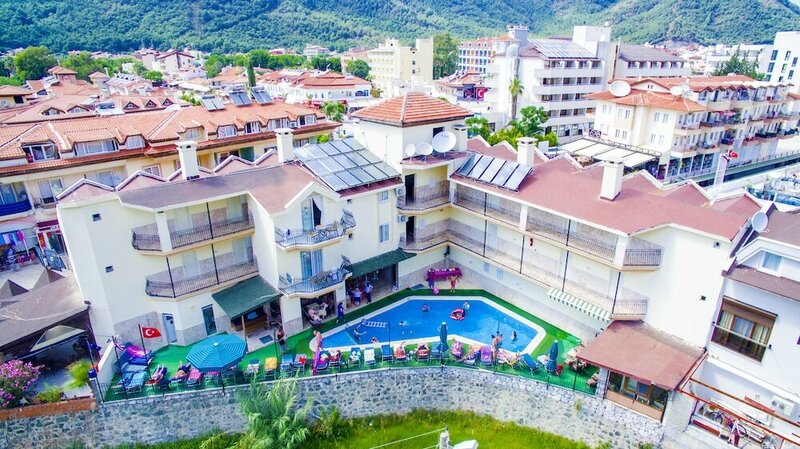 Скажем так, на 4 с + или на 5 с -. В целом очень хороший апарт, номера со свежим ремонтом, очень чистые, все в порядке, все работает, уборка ежедневная. Бассейн есть маленький, но чистенький. Бар, в котором любят пить английские пенсионеры (это основной контингент апарта). Хозяин очень хороший, адекватный, заботливый, но не навязчивый. Отель расположен на центральной дороге. Это и плюс (рядом остановка, не пришлось даже брать такси, довезла маршрутка от автовокзала Мармариса практически до входа) , но это и шум. Напротив бар. Музыка заканчивается строго в 12, а вот рев мотоциклов на дороге и пьяный ржач не заканчивается порой до утра. Из-за этого хотела съехать из апарта, но хозяин предложил освобождающийся номер с видом на бассейн. Там с балкона видно горы, и слышно только уток в протекающем рядом канале. Там было замечательно. Поэтому в целом, очень довольна. А по поводу шума, если чутко спите, уточняйте сразу, чтобы вид был на бассейн.