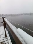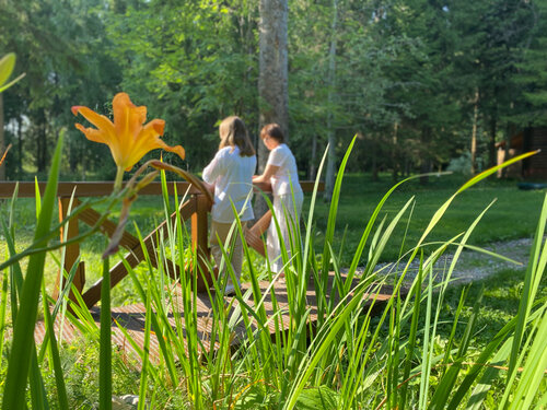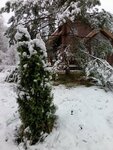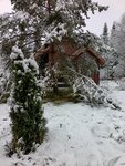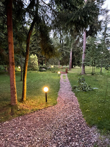 Чудесное место в хвойном лесу, да еще и с выходом к озеру. Как в сказке. Парковка на территории. Домики прям как-будто из мечты - внизу огромные окна, а на втором этаже круглые.