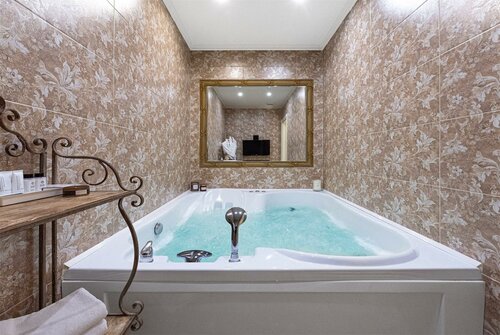 Номер в стиле прованс, приятно и по-домашнему. В ванной хорошие средства гигиены, зубная паста со средней жëсткости зубной щëткой, гель-шампунь и кондиционер, гель для рук, сама кулель оснащена гидромассажем из восьми насадок, по четыри с каждой стороны -слева и справа, отличный напор подачи воздуха, чистые свежие полотенца по два на каждого гостя+полотенце для ног, так же в ванной комнате имеется регулируемый полотенцесушитель, хоть ванная комната сама малогабаритная, но в ней соблюдены нормы аргономики, вместилось всë и средняя раковина с вместительной тумбой и унитаз и просторная купель с углублениями для опоры при вставание и удобное изголовье , полностью заслоняющие от брызгов воды раздвижные перегородки. Имеется фен ,но так как его спирали нагревались до огненного состояния издавали палевый запах ,то находчивая сотрудница Ирина предложила замену из личного арсенала, фен с хорошим обдувом.Что действительно порадовало это удобная широкая постель , плотные в меру подушки, идеально чистое свежее хлопковое бельë гостиничного стандарта, высокое изголовье у кравати, также имеются по два светильника прикроватных с каждой стороны при которых удобно читать или оставить на ночь, так как один имеет тёплое и другой холодное освещение.