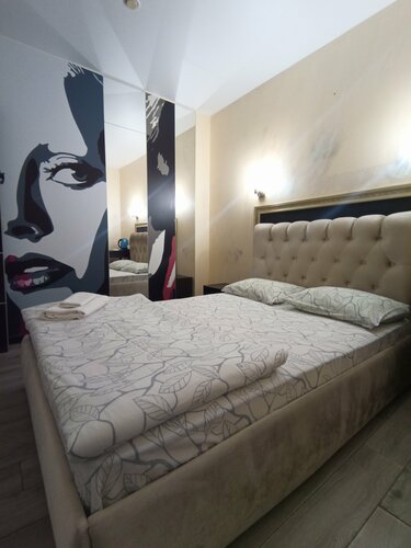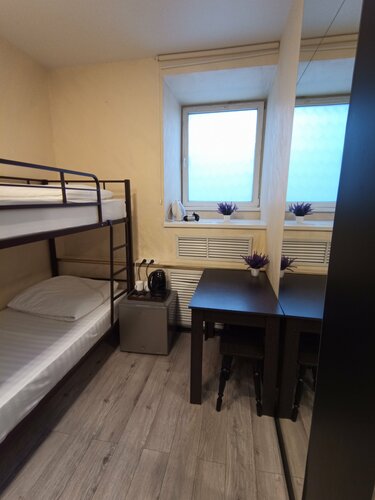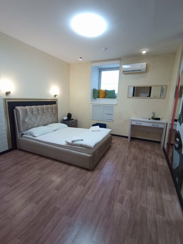 В номере есть всё - мини-кухня с холодильником, чайником, микроволновкой, посудой и с собственной раковиной, отдельный огромный санузел с ванной, унитазом, раковиной и всем необходимым типа фена, шампуня, зубной пасты и тд. Большая двуспальная кровать с удобным матрасом, чистым бельём и дополнительными подушками. Розеток несколько, в тч и рядом с кроватью. Кондиционер, вентилятор, тепловентилятор, открывающееся окно - климат на любой вкус.
