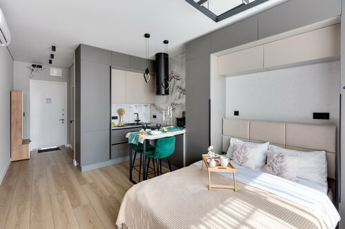 В «SNOWY PEAKS STUDIO» можно разместиться вдвоём, дети до 5 лет размещаются бесплатно без отдельного спального места. Заезд с 14:00, выезд до 12:00. В апартаментах есть бесплатный Wi-Fi. Кухонная зона оснащена холодильником, варочной панелью, вытяжкой, электрочайником, микроволновкой, тостером и полным набором посуды. В санузле — душ. В прихожей достаточно места. Предоставляются полотенца, шампунь, гель, мыло, зубной набор и тапочки. Возможно проживание с животными за дополнительную плату. Есть удобства для людей с инвалидностью — лифт, пандус и парковка. Номера для некурящих. На территории есть детская площадка, рядом — магазины и метро.