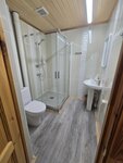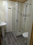 Туалетных комнат 2 - по одной на первом и втором этаже, что отлично, т.к. людей много и лестница не особо внушает доверия для спуска в сонном состоянии. В туалетах есть раковины и полки, можно там чистить зубы и умываться. Бумага, бумажные полотенца, мыло и тканевое полотенце - всё в наличии. Большая раковина с комодом, зубным набором, зеркалом и феном (на стене висит слабый, а в верхнем ящике помощнее) размещены в проходной комнате между сауной и душевой. Душевая - это большая комната, отделенная от проходной шторкой. Ведра для обливания на стене нет (оно было на фотках на сайте гостиницы), стоит лавочка и есть 2 душа с гибкими насадками, установленных на противоположных стенах. Висят диспенсеры с шампунем и гелем. То есть это душевая комната как в общественном бассене, и в этой зоне возникли все минусы дома.