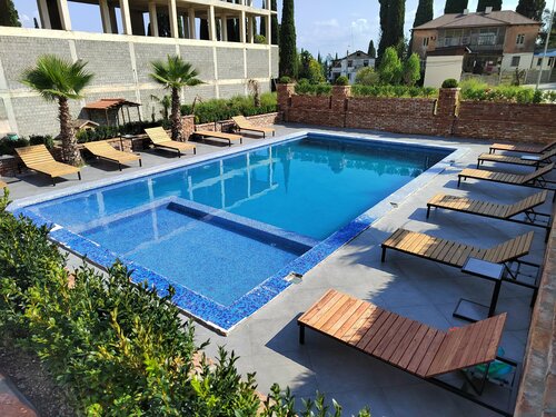 В общем, отличный отель. Очень красивый, гармонично сливается с природой. Островок современности в Абхазии. Понравилось. Приехала бы сюда еще. Приезжали в июле, в будни, с чт. на пт. на сутки. Прекрасно отдохнули. Жили в номере на 2 эт. с балконом. Номер чистый, большой, застелено белое, чистое белье. Сантехника свежая. Интерьер номера и отеля очень стильный, современный, соответствует названию. Дают халаты, в номере лежали обычный комплект полотенец и полотенца для бассейна, нам одно не доложили, но по запросу администратор быстро его принесла. Есть телевизор, холодильник, чайник, набор для чая (черный, зеленый и сахар), посуда (кружки, тарелки, приборы на 2х), фен, мыло, гели и шампуни. С балкона очень красивый вид, виден Монастырь и горы, на нем есть сушилка, столик и стулья. Но справа от отеля стоит недостой, что немного омрачает вид. Бассейн классный, чистый, приятно около него отдохнуть с коктейлем, минус, что около бассейна нет зонтиков, но несколько шезлонгов стоят под пальмами, людей около бассейна почти не было, сезон, все на море, мы лежали под пальмами. Нормальный немного скудноватый завтрак, но точно найдете, чем наесться. Мы были сутки, нам было вкусно, надоесть не усело. На завтраке шведский стол - была каша, сухой завтрак, яйца, огурцы, перец, помидоры, баклажаны запеченные, сыр, колбаса, сосиски, тосты, кукуруза, лапша, запеканка творожная, орешки со сгущенкой и сочники с творогом, молоко, чай, кофе растворимый. Не хватило для полного счастья вареного кофе, фруктов, выпечки, типа блинов или оладушек. Брали лимонад за отельную плату, 150 руб. за 0,5 местного Тархуна. Оплата наличными или перевод на карту.