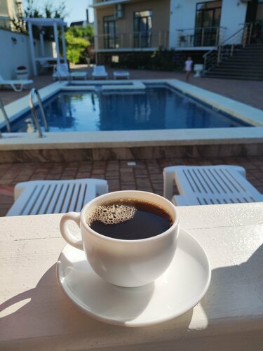 На территории кафе,вечерами сидишь слушаешь приятную музыку,персонал отличный,вкусные напитки,безумно вкусный шашлык и вся еда с меню.(Но понятно дороговато т.к на территории отеля).Но мы его обожали и сидели каждый вечер.