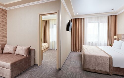 Хороший отель, правда далековато от центра, полчаса на такси от вокзала. Выбрали его, т.к. приехали из другого города на юбилей друзей. Праздник был здесь же в ресторане Алмаз. Бронировали стандарт без завтраков. Номер чистый, но в некоторых местах на стенах остались прибитые комары, видимо, москитная сетка летом не помешала бы, хорошая душевая, есть шампунь, гель для душа в дозаторах и набор для чистки зубов. В номере было очень тепло (были в декабре), хотя батареи были выключены. Когда приоткрывали окно, то был отчетливо слышан шум с дороги. При закрытых окнах шум не беспокоил. На ресепшен работала милая девушка. Быстро нас поселила, а когда мне понадобилась гладильная доска, сама ее тут же принесла в номер с утюгом. Отель рекомендую.