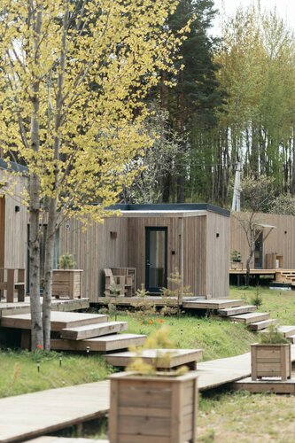 Вокруг ухоженные газоны, между домиками проложены дорожки из деревянного настила. Атмосфера спокойствия и гармонии создаётся благодаря уединению с природой и живописным видам.