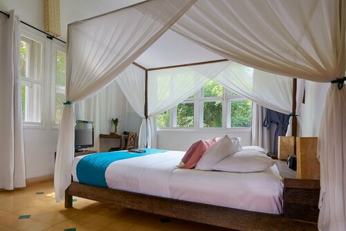 Здесь созданы все условия для комфортного проживания — есть кондиционер, холодильник, телевизор, фен, чай/кофе в номерах, сейф, терраса, мини-бар. Уборка — по запросу.