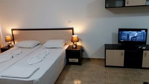 Мне очень понравилось расположение апартаментов: до всего близко. Меня интересовала грязелечебница (5-10 мин), море - тоже самое. Автовокзал и центр - 5-10 мин. Претензий к самим апартаментам не имею, я-активный турист, в комнате не сижу. Все что нужно: холодильник, чайник, кухня с набором посуды, душ, горячая вода, телевизор, лоджия со столом и стульями, сушилка - имелось. Иногда я ходила по кафешкам, иногда покупала еду в супермаркетах, делала салаты. Отдых очень понравился. Мусор за собой выносила сама (мне не трудно). Уборка...я просто не сорила. Короче, если вы без особых претензий, и хотите недорого отдохнуть - вам сюда.
