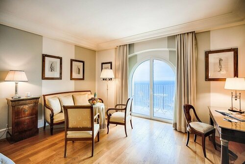 Историческое здание на холме. Из номера ошеломительные виды на море! У нас был номер из двух комнат с балконом. Интерьеры дорогие и очень продуманные. Музейные экспонаты в главном холле, создают атмосферу конца XIX столетия. Но!