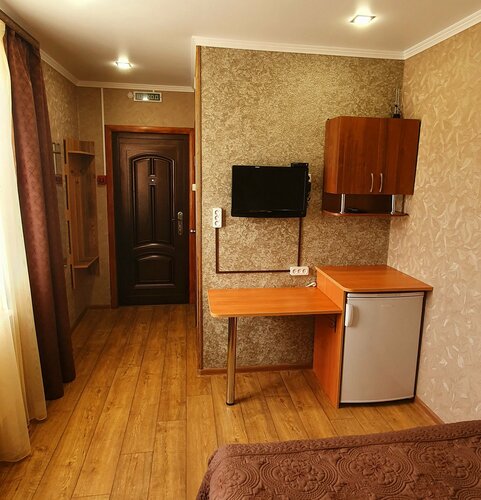 Дом Туриста, находится на центральной улице посёлка. Закрытая территория. Внутри небольшая парковка. Стандартные комнаты очень давно не ремонтировались. Стены ,где то грязные, где то обшарпанные, мебель где то порвана, где то расслоилась.Пол скрипит, краны подтекают. В номере чайник, холодильник, ТВ. Кондиционер.Белье чистое. В санузле душ открытый, если его принять то весь пол мокрый. Без сланцев ноги намочить на раз. Вентиляция слабая. Горячая вода от нагревателя. Иногда необходимо ждать когда нагревается. Есть общая кухня. там холодильник, плита, микроволновка , чайник, посуда. Во дворе чисто, не большой водоем, детский батут, крытый стол, мангал. Рядом рынок не большой, несколько кафе, магазины, аптека. Владельцы доброжелательны. Возможно другие номера лучше