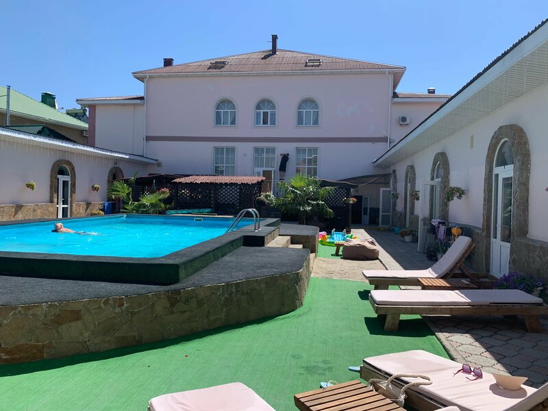 Начну с того, что не соглашусь с негативными отзывами, потому что хочу сразу сделать акцент на том какого типа этот отель. Это не огромный на несколько сотен номеров отель где по несколько горничных на этаж, где круглосуточно дежурят на рецепции по несколько менеджеров со знанием английского, немецкого, французского и так далее, где столовые с кучей официантов и барменов, ну и всё в этом духе. Это семейный отель, по ощущениям на полтора десятка номеров, где есть всё необходимое. Приветливые и отзывчивые хозяева, которые помогут решить возможные возникшие проблемы и вопросы. Территория достаточная, никто не ютиться. Большой бассейн, со слегка солёной водой из скважины, что создаёт ощущение морской воды. Нормальное питание (если захотите можно заказать обед и ужин). Хорошая уборка номера и территории, всё чисто. Есть парковка, места хватает. До пляжа близко, можно пройтись минут 7-8, можно поехать на более благоустроенный с развитой инфраструктурой, ехать тоже минут 7-8, в общем кому что больше нравится. Отдельно для любителей животных в отеле много хозяйский котов (очень классных) и есть собачка❤️❤️❤️ Также плюс для курящих, что можно курить почти везде на территории. Есть мангал, кухня, баня. В общем кто любит семейные отели - рекомендую!