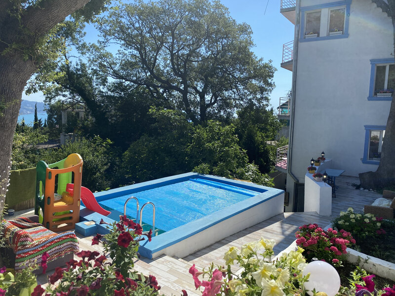 До моря действительно далеко. Яндекс пишет 750 метров, на деле же это 1,7 км, пешком в районе 20-30 минут, в зависимости от того спуск это или подъём, а подъёмы здесь крутые. Мы ездили на море либо на гольфкаре (150р с человека), либо на такси (порядка 350р). Получается, что доехать на Массандровский пляж по деньгам будет сопоставимо, но это для двух-трёх человек.
