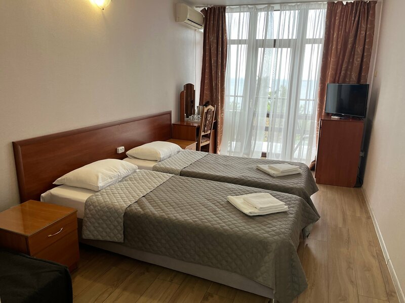 Пляж находится в 100 метрах от пансионата и оснащён душевыми, навесами от солнца, лежаками, кабинками для переодевания.