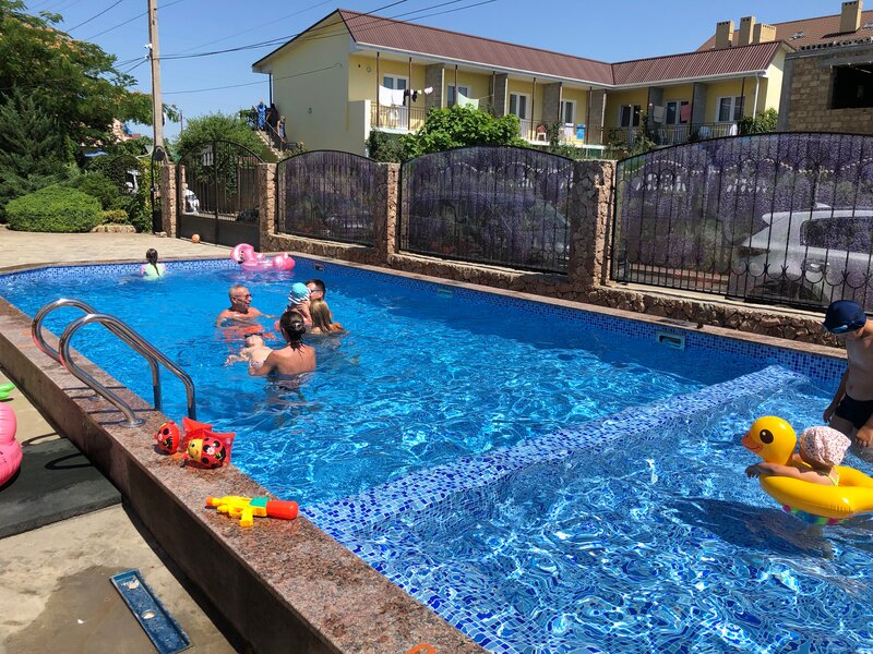 На территории бассейн с детской зоной, вода чистая, хлорированная. Зона отдыха для детей( горка, батут, машинка) зона отдыха для родителей ( беседка 1 на территории и зона для курения и зона с лежаками возле бассейна).