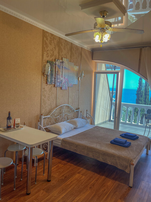 Плюсы: свежий ремонт в номере, есть мини кухня с мини холодильником, чисто, уборка и смена белья и полотенец раз в три дня, вода - горячая и холодная- есть всегда, просторный санузел, сплит работает, балкон с видом на море, пляж в 3-х мин ходьбы, море чистое и теплое!