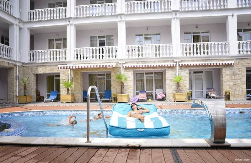 Хорошая вилла с хорошей территорией, есть бассейн, хорошие номера и их уборка каждый день и смена белья раз в три дня, шампуни, кондиционер, гель и чистые полотенца, все так и есть, как и заявлено, даже удобный диван для сна и матрац не плохой. Прекрасные завтраки, изобилие блюд, при условии даже если придете под закрытие, все равно останется еда и её достаточно и ещё можно взять чуть с собой, если не наглеть и перекусить в обед. Так же есть свой ресторанчик с хорошей кухней, скажу сразу, я кушал тут, потому что в центре был в пару кафе и еда там… мне не зашла и по цене так же. Есть хамам, спортзал, хоть и не большой. Есть где поиграть детям, правда расчет брать на маленьких) моим хватало. Территория охраняется, есть своя парковка для транспорта, гараж для хранения тех же колясок и сапборда) лежаки можно брать у охраны, их достаточно!