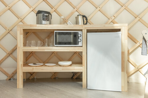Дорожки щебнем, свет везде где нужно. В юрте тепло, светло, сухо. Постель сухая. Есть фумигатор, электрический калорифер (печь дровяная для зимы), душ, туалет, вода горячая, холодная из крана - питьевая! Холодильник, чайник, мультиварка, стойка для готовки, стол обеденный, стулья как дома. Всё в юрте, всё работает! +++