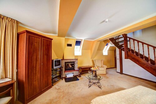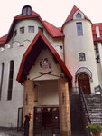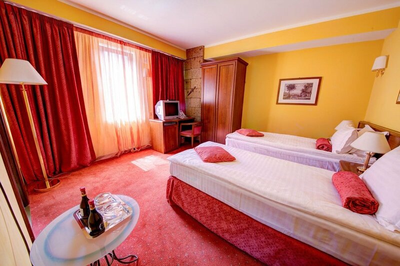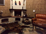 Оказались в этом небольшом отельном комплексе в лесистых горах в 12 км от Брашова не случайно: с проживания в замке начался наш насыщенный летний Dracula tour по Трансильвании. Нам дали улучшенный (по здешним меркам) номер категории de luxe в отдельно стоящем домике. Мебель и сантехника, очевидно, знавали и лучшие времена, но если особо не привередничать и не зацикливаться на мелочах (нам, скажем, не повезло с электронным ключом, упорно не желавшим открывать дверь даже после замены карточки), для проведения пары-тройки суток летом или недели в горнолыжный сезон подходит почти идеально. Вверх по красивой лестнице или на лифте главного замка – просторный ресторан с качественной местной кухней и выходом на террасу. В холле можно посидеть у камина, где к вашим ногам услужливо припадёт «шкурный» медведь. Вниз по ступенькам в «подземелье» – SPA (попасть не задалось) и комната пыток, где большие оригиналы устраивают мальчишники, а детки, входя в раж, готовы укоротить на голову маму, устроившуюся на пыточном ложе для фотосессии. Об этом вам охотно расскажут девушки с ресепшена, любезно разрешив и самим попробовать себя в роли палача или жертвы, и предложив в шутку сделать средневековый «маникюр». При этом хорошо бы иметь не только железные нервы и устойчивую психику, но и крепкое здоровье, так как в случае проблем врач по мед. страховке (в нашем случае – по звонку в страховую компанию) сюда не добирается, во всяком случае летним вечером. В итоге русскоязычная Людмила, работающая и на стойке регистрации, и в спа-центре, превращается в колдунью (и в этой роли она великолепна!) и, присев на корточки, пытается лечить опухшую конечность согревающими пассами по одной ей ведомой японской методике. За что целительнице огромное спасибо! И пусть болезненная отечность голени не спала, но такое внимание было очень приятно и трогательно.
