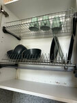 Своя мини-кухня с отдельным светом, варочной панелью, кухонными принадлежностями (кастрюля, сотейник, сковорода — почему-то без крышек, правда, все), столовые приборы, тарелки, чашки, бокалы, электрочайник, микроволновая печь, мини-холодильник, раковина, сушилка для посуды.