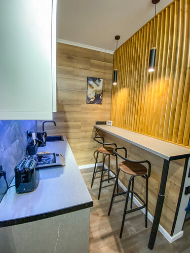 Апартаменты оснащены удобными кроватями с ортопедическими матрасами и современной мебелью. Кухня полностью оборудована. Гостям предоставляются полотенца, банные халаты, косметические наборы и другие бытовые мелочи. Также можно воспользоваться услугой массажа.