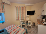 * Все более менее чисто, все имеется.Плита,микроволновка,холодильник,соль,сахар,чай и растворимый кофе. Может конечно кто то оставил. Но есть и минусы.1. Если вы едите на машине,отсутствие парковки.Хотя во дворе много свободных мест, могли бы этот момент как то продумать, а сваливают все на власти города,что человек должен быть прописан в этой квартире.Если вы занимаетесь этим бизнесом, значит пропишите кого нибудь чтобы было 1 парковка место.Просто будьте к этому готовы,может для кого то это не минус.2.Отсутствие администратора ресепшена,вроде позицианируют себя как отель,но в отеле происходит ежедневная замена полотенец и тд.Здесь в силу того что нет человека который за этим следит, полотенца не меняются, мусор не выносится, уборки тем более нет.Тоесть это как съемная квартира больше чем отель.Ресепшен используют как хранение каких то своих расходных материалов в виде как раз таки туалетной бумаги и тд и всё это лежит прямо на входе.Так же вас встречает на входе темнота, ничего не видно.Отсутствие в комнате зеркала в полный рост, очень не удобно когда собираешься выходить из номера каждый раз и смотреться в коридоре ресепшена, потом заходить обратно.Кое где местами нужно сделать косметический ремонт уже.Особенно входная дверь которая встречает посетителей, она вся ободрана. По номеру сами видите косяки на фото.В чистых полотенцах были найдены чёрные волосы, смотрите более тщательно после стирки.Может быть попали волосы уборщиц.Так же у нас в номере не работал замок при нашем заезде, об этом никто не предупредил и не отремонтировал его. Даже не извинились за это, не предоставили никакого комплимента, и не пошли к нам на встречу когда мы хотели раньше съехать, будьте внимательны, если вам нужно уехать,отель на встречу не пойдёт и не вернет вам сумму денег(как сказал озон,хотя это на усмотрение отеля),но отель отказывает в таком,да, это прописано на озоне,но не нужно пудрить голову поситетелям и говорить обратитесь на озон это ваш агригатор,а озон говорит что это отель принимает решение, можно было просто сразу сказать когда задали вопрос, что НЕТ, мы такое не делаем!При этом сейчас самый сезон, легко бы заселились люди, но просто никто не захотел для нас этого делать.((Кстате, из за отсутствия человека на ресепшене при заселении даже не было предложено контактов куда обратится по любым вопросам если они возникли, а так же на телефоне бронирования сидит один и тот же человек она отвечает и за уборку и за бронирование.При этом не принимает решения, тоесть ответственного лица в случае чего нет. Ну и если у вас сел телефон в «отель» вы не попадаете, будьте внимательны. Не знаю с чем это связано, но при входе всегда по крайней мере все 4 дня что мы были пахло как в столовой, едой, возможно плохо работает вентиляция, а кто то готовит. Пахло все время. Так же ты не знаешь адекватные с тобой жители живут или нет, не чувствуешь себя безопасно. При заселении паспорт и тд не спрашивают.Впринципе человек может купить номер,заехать по коду и делать все что угодно если захочет, остается только надеется что люди вокруг адекватные.