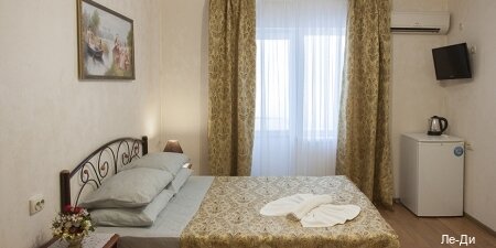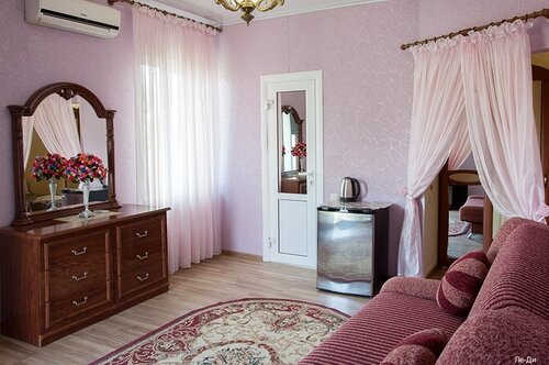 Отель «Ле-Ди» находится на первой линии от моря, есть выход прямо на пляж. На территории — открытый и закрытый бассейны, один из них с подогревом. Работает спа-комплекс с соляной пещерой и арома-комнатой. Есть ресторан на веранде, летние террасы, сцена с вечерними шоу-программами. Для детей оборудована площадка. Предоставляются бесплатные велосипеды и парковка. В номерах — современная мебель, санузел, телевизор, чайник и посуда, в некоторых есть балкон. Питание по системе «шведский стол» в основном корпусе. Уборка и постельное бельё включены в стоимость проживания. Курение разрешено в специально отведённых местах. Также предоставляется трансфер.