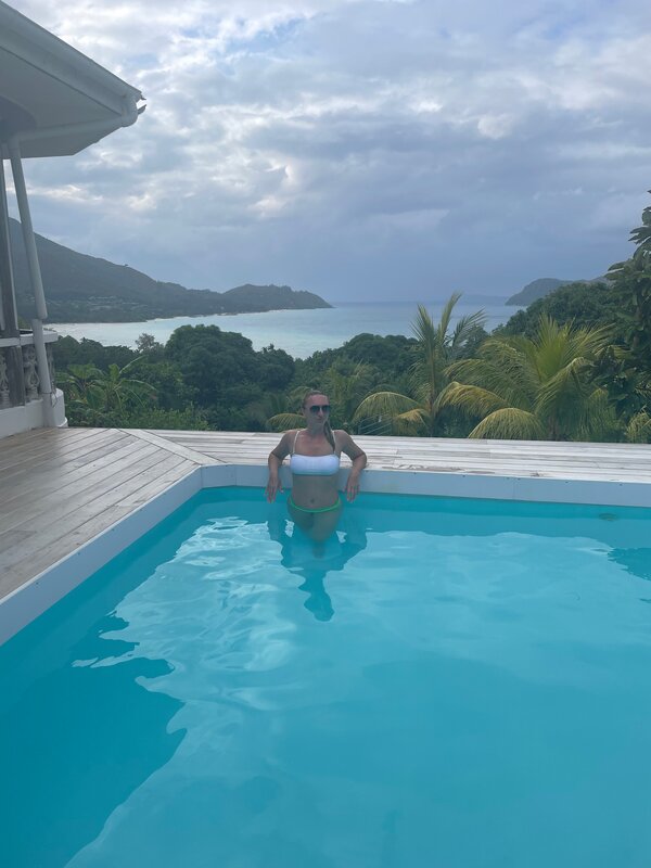 Отличные Аппарты, просторные, очень чистые, удобная кровать и подушки, белоснежное белье, изумительный вид с балкона, на котором мы ужинали под красивые закаты Праслина. Каждый день производилась уборка и мыли всю грязную посуду, что мне очень нравилось. Рядом с апартами растут ананасы и куча других растений. На территории есть бассейн с восхитительным видом. Хозяйка очень добродушная и отзывчивая, организовала нам яхту для рыбалки за 300 евро. Сами апарты находятся на горе не далеко от пляжа, но он не купабельный. Без машины эти аппараты не рекомендую. Пешком везде далеко. Кстати хозяйка может встретить и в порту и в аэропорту и предлагает за нормальную цену авто в аренду. А так расположение апартов, если вы на машине более чем удачное, от Анс Лацио близко, до магазинов так же. В общем рекомендую. На фото вид с балкона.