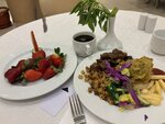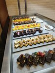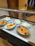 завтрак: блинчики, яичница (глазунья, микс – по просьбе, на выбор) яйца вареные, картофельное пюре, фалафель (очень вкусная штука, что-то по форме фрикаделек, по вкусу напоминют наши драники, к ним подойдёт йогурт без вкусов и наполнителей – тип «простокваша»), картофель, йогурты, снеки с молоком, омлет, салаты, сладкие каши, рис в виде гарнира, рыба, мясо, сосиски куриные и говяжьи, колбаса куриная и говяжья, ветчина также 2ух видов, сыры 3 видов: мягкий, полутвёрдый, сычужный, разнообразная выпечка, видов 20ти, джемы, мёд, халва тахинная, запечённые и свежие овощи – много свежих овощей!, зелень – много зелени!, фрукты – много свежих фруктов: гуава, грейпфруты, мандарины, апельсины, бананы.