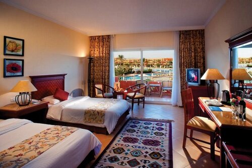 Так как мы прибыли в отель ко времени чек-ина - прямо к заселению, нас сразу заселили в номер, согласно нами забронированного тура: самый дешёвый, на момент покупки - Релакс Ареа, удалённый от основного корпуса, метров на 200, со своим отдельным бассейном и баром, прислушавшись к нашему пожеланию: мы просили номер на 3тьем этаже, на солнечной стороне. Хороший, просторный удобный номер, с прекрасным видом на бассейн и замечательным хаускипером Мохамедом, в частично реновированном интернациональном корпусе. Из незначительных нюансов: мини холодильник работал громче обычного, а роутер, я бы расположил где-нибудь в прихожей, чтобы не мешал ночью своим зелёным морганием отдыхать. Номер был полностью подготовлен к заселению: чисто убранный, туалетная бумага, база с порционным пакетированным кофе, чаем, сахаром, сливками, электрическим чайником, бутилированная питьевая вода, в количестве 2х полулитровых бутылочек, с дороги закипятили чайник, попросили ещё воды, хаускипер без проблем принёс.