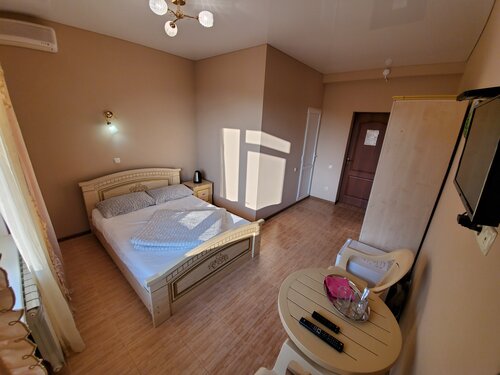 Ремонт сделан для простоты уборки а не для вашего комфорта. Так уж получилось что мы видели состояние 2 номеров своими глазами. Нас переселили из номеров с балконом которые мы бронировали за пол года, в номера без балкона под предлогом ошибки в записях бронирования... Кровати в номерах расшатанные и скрипят как телеги. В 1 номере кондиционер был почти новый, холодил отлично, в другом это древнее что то, которое не чистили ни разу, фильтра забиты наглухо, кондиционер направлен прямо на кровать, ночью особо не поспишь. Вытяжки в туалетах воют так что кажется что включена твоя, идёшь смотреть и понимаешь что это соседская)) шумоизоляция посредственная, слышно все и всех, кто кого и в какой позе имеет, кто вчера перепил и исполняет арию перед унитазом, чей ребёнок провинился и все в этом духе... Входные двери картонные без уплотнителей... Некоторые люди ими хлопали так что аж подпрыгиваешь с кровати, и это все начинается с 7 утра.. Телик в номере размером с планшет, тормозит, тупит, смотреть можно только стоя напротив, углы обзора никакие. Разница между номерами с балконом и без есть, она не грандиозная, но в нюансах есть, в номере без балкона ко всему сказанному плюс занавески что марля, стол низкий, стулья выше стола, вещи сушить на заднем дворе, в остальном в номерах без балкона, в лицо вам, просто плюнут, чуть жирнее так сказать )) кухня типа, которая есть, для гостей... Ну такое себе, если своей посуды нет, будет вам печально, посуда как будто со свалки, но есть требования по её уходу)) в остальном что то подогреть, сварить, можно. Хозяин конечно ещё тот... Пытается создавать впечатление доброго простачка, но на самом деле, вообще не такой, из под тишка будет вас подслушивать и следить, предлогать будет услуги свои и друзей, которые будут либо дороже, либо менее качественными, в критической ситуации касающейся денег он вам на встречу не пойдёт, зажмется даже за 300р... Была ситуация с другими ребятами отдахающими, которой они поделились с нами... А что больше всего добило, но это уже не к гостинице претензия, так это стоки которые текут прямо в море, по дороге к пляжу идёт как раз такая река, запах стоит соответствующий... Кстати слив с раковины кухни этого заведения как думаете куда направлен?))) В общем очень противоречивые чувства у нас остались, ездили парами и у всех в принципе одно и тоже... Жить можно, но лучше переплатить чуток и найти что то получше