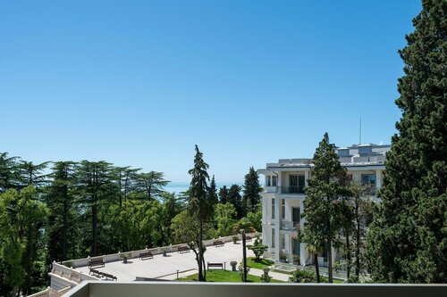 На территории комплекса есть охраняемая парковка, зелёный двор с оливковым деревом, терраса, фитнес-зал и гольф-симулятор. Лобби, лестницы и холлы выполнены из дорогих материалов. Из апартаментов открывается вид на море через деревья.