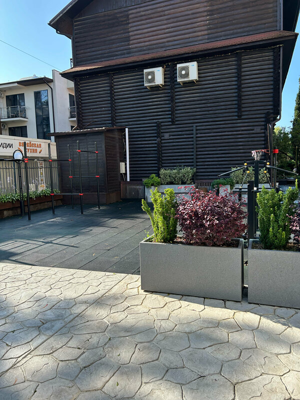 Хоть и не большая,но ухоженная территория, несколько бассейнов, подогреваемых,лежаки.
