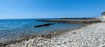 Пляж - преимущественно крупная галька, у воды можно найти участки с мелкой галькой. Чистый, регулярно убирается. Вход-выход в море с берега затруднён волнорезом, пролегающим в нескольких метрах от линии воды, и довольно крупной галькой. Но в "коралках" вполне нормально всё это преодолевается. Удобнее всего пользоваться лестницей на другом, уходящим вглубь моря волнорезе, как в бассейне, или нырять с него, если прозрачность воды позволяет убедиться, что траектория прыжка не пересекается с подводными булыжниками. Основная прелесть этого пляжа - в его немноголюдности, что очень трудно найти на Черноморском побережье в пик курортного сезона, в отсутствии мчащихся по головам купальщиков гидроциклов и катеров, бубнящей музыки из увеселительных заведений. Не единожды, мы днём оставались на пляже вдвоём. Если прогуляться, неподалёку есть несколько пляжей побольше и с хорошим входом в море. По факту, мы вдоволь наплавались и на этом пляже, и на соседних тоже.