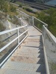 Для спуска к ближайшему пляжу смонтирована металлическая лестница. Снизу она смотрится устрашающе, в плане крутизны подъёма, на деле же преодолевается довольно просто и быстро. Переход под железной дорогой покрыт деревянным настилом.