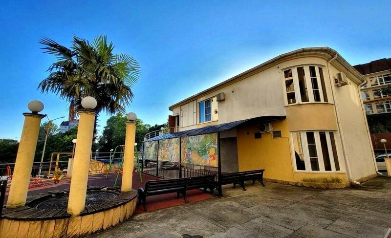 Тихий район, благоустроенная территория, есть детская площадка. Местность горная, до пляжа "Альбатрос" не далеко, минут 15, но нужно сначала подняться по ступенькам вверх (там же расположена автобусная остановка N4,7р), потом спуститься вниз до пляжа. С детской коляской тяжело, мы ходили на пляж без нее.