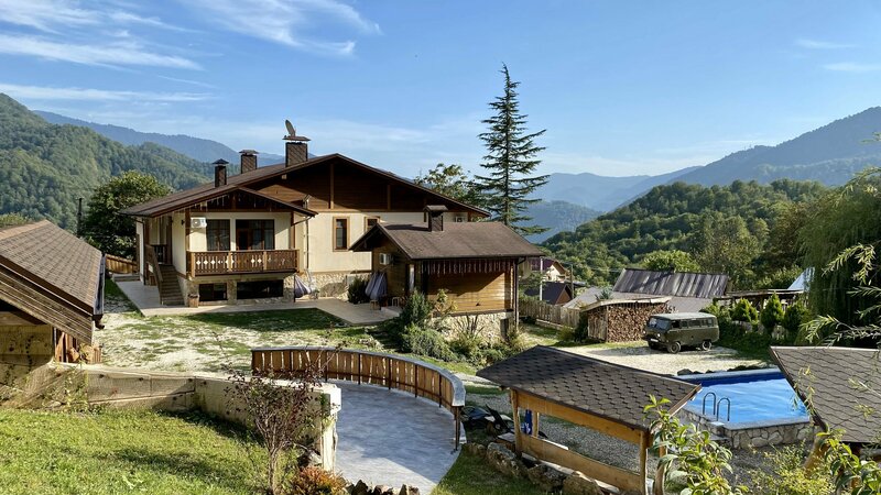Кроме этого, масса приятностей на локации: помимо центрального чудесного дома с номерами несколько домиков на склоне горы, бассейн, баня, купель, зона для шашлыков и шикарное пространство для игр, танцев, вечеринок.