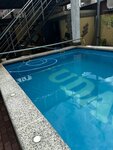 Во дворе тоже кухня с мангальной зоной, столики. Прекрасный бассейн с подсветкой и гейзером. Можно подняться на площадку сверху и позагорать на шезлонгах.