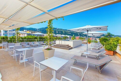 Реально хороший отель . Можно комфортно отдохнуть не выходя из отеля . Есть бассейн и 2 джакузи , расположенные каждый на отдельном этаже . Много террас для загара . Отличный завтрак с игристым . Персонал отеля очень приветливый и дружелюбный . Расположен в центре города в 5 минутах ходьбы от жд вокзала и 10 минутах от порта , где расположены пляжные зоны . Чтобы подняться в город из порта , если вы с багажом, лучше использовать лифт . Только положительные впечатления .