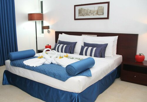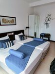 Не скажу что прям уютный номер. В ванной комнате постоянно неприятный запах. Из принадлежностей только мыло двух видов, жидкого и то на донышке. Так что берите свое или покупайте в ближайшем магазинчике, он кстати в 2-х шагах. Рядом с мусорным ведром плесень, да и не только там, на раковине все в плесени. В ванной какие то ржавые крючки и плохой слив что у душа, что у мойки. Полотенца грязные и с мертвыми жуками. Балкон тоже грязный. Для белья нет веревки или сушилки. Шкаф весь в грязных следах, зеркало заляпанное. Но зато есть сейф, телевизор, чайник, кондиционер, вентилятор на потолке. Белье тоже с какими то пятнами и дырявое. Занавески с обратной стороны тоже в дырах, одеяла нет, укрываться простынкой, но оно и не нужно, жарко же. Уборку нужно просить, сами они не предлагают и не убирают, мусор так же не выносят. Мы ставили за дверь и ждали пока выкинут.
