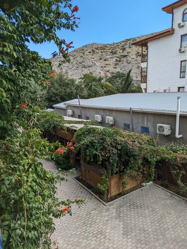 Один минус - соленая вода в кранах, как минералка. До пляжа и набережной 400 метров. По пути три столовые. На фото вид с балкона крайнего номера второго этажа.