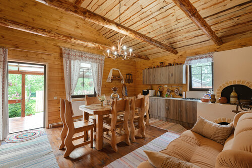 Дом построен в современном стиле, одноэтажный,но под свои задачи ,под сдачу в аренду под и дизайн старину так сказать, в нем три комнаты,в каждой свой сан узел,фен и душ, телевизор со спутниковым ТВ,свой двор под две машины,беседка и мангал,в целом все необходимое есть,кухня со всеми нужными кастрюльками и сковородками маслом и чаем и солью, полотенца есть в каждом номере, удаленность от всех достопримечательностей в км,максимум в 1,5.Мне все понравилось, рекомендую. Баня отдельно на улице через огород,если с маленькими детьми то имейте ввиду, мы были в ноябре,не очень удобно, но не невозможно, главное настрой взрослых.