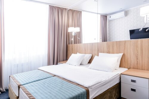 Номер оказался просторным и чистым. Кровати удобные, матрацы в меру жёсткие, постельное белье без пятен (хотя один комплект был не в очень потребном состоянии - на пододеяльнике были мелкие дырочки, а подушка не очень "свежая" - наполнитель подушки уже начал сбиваться в комки + тонкая и мягкая).