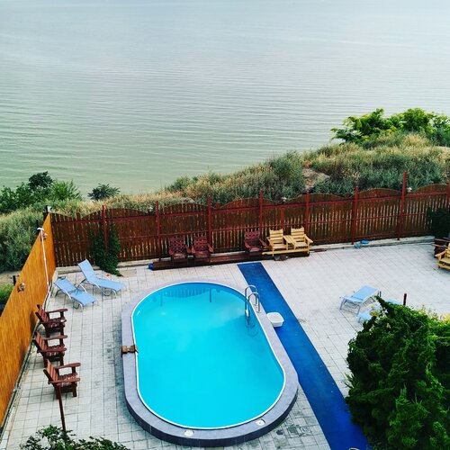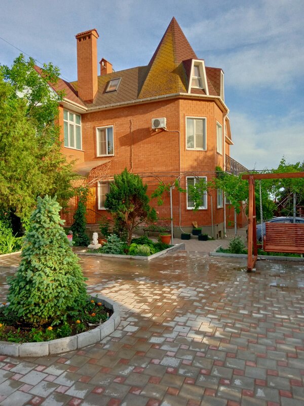 Очень красиво. Уютно. Приятные хозяева. Сняли бунгало внутри места не много, но есть где спать двухспальная кровать, холодильник, чайник, чашки для чая. Туалет и душ. Во дворе очень красиво, уютно, качели, беседки, мангал и бассейн. В общем доме есть кухня и все принадлежности для приготовления обеда. Там же можно покушать, а можно сесть во дворе места для пообедать и просто поболтать. Шезлонги. Рядом в метрах 200 , Азовский залив правда чтобы поплавать нужно далеко идти. Очень хорошее место. Если ещё раз поедим обязательно остановимся.