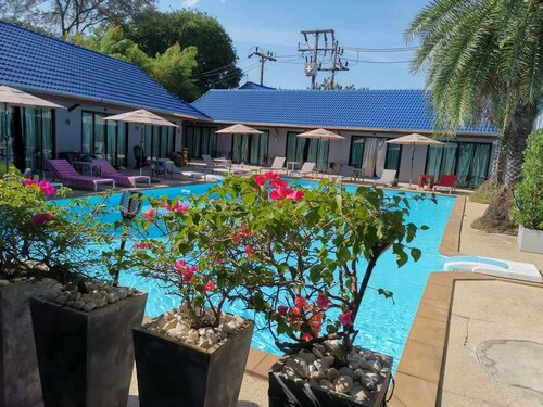 Плюсы. Недалеко от пляжа. Рядом магазины. Недорого. Мы брали на несколько дней за 2100бат за номер. Доплатили за завтраки по 400бат за двоих. Буквой Г одноэтажное строение, в котором нарезаны ячейки примерно по 16- 18квадратов, это номера. Они все одинаковые. Внутри бассейн как на фото. Рядом, прям рядом проходит улочка, нет накокой преграды, с которой все проходящие и проезжающие видят все внутреннее пространство, при желании зайти. Не очень комфортно, но кому как. Супер вечерние-ночные прогулки по пляжу!