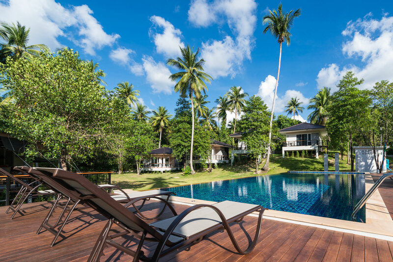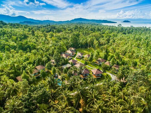 Классные домики, огромная веранда в окружении джунглей.