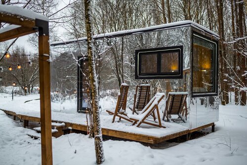 - окна домика направлены в лес, можно не переживать, что кто-то тебя увидит, несмотря на панорамное окно нет ощущения «аквариума»