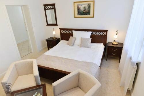 Здесь созданы все условия для комфортного проживания — есть кондиционер, холодильник, телевизор, фен, утюг, отопление, мини-бар. Уборка — по запросу.