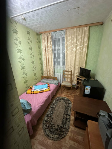 Телевизор в номере работает, даже есть холодильник, чистые полотенца на каждой кровати, постель старая, но вроде чистая.