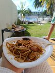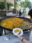 Также на улице в огромной сковородке готовят либо пасту либо поэлью + жарят на гриле мясо в оснвонм ребрышки и можно взять Бургер булка+котлета +соус