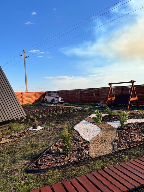 4. Красивые локации для отдыха и фото: ретроавтомобиль, качели, икебана, клумбы.